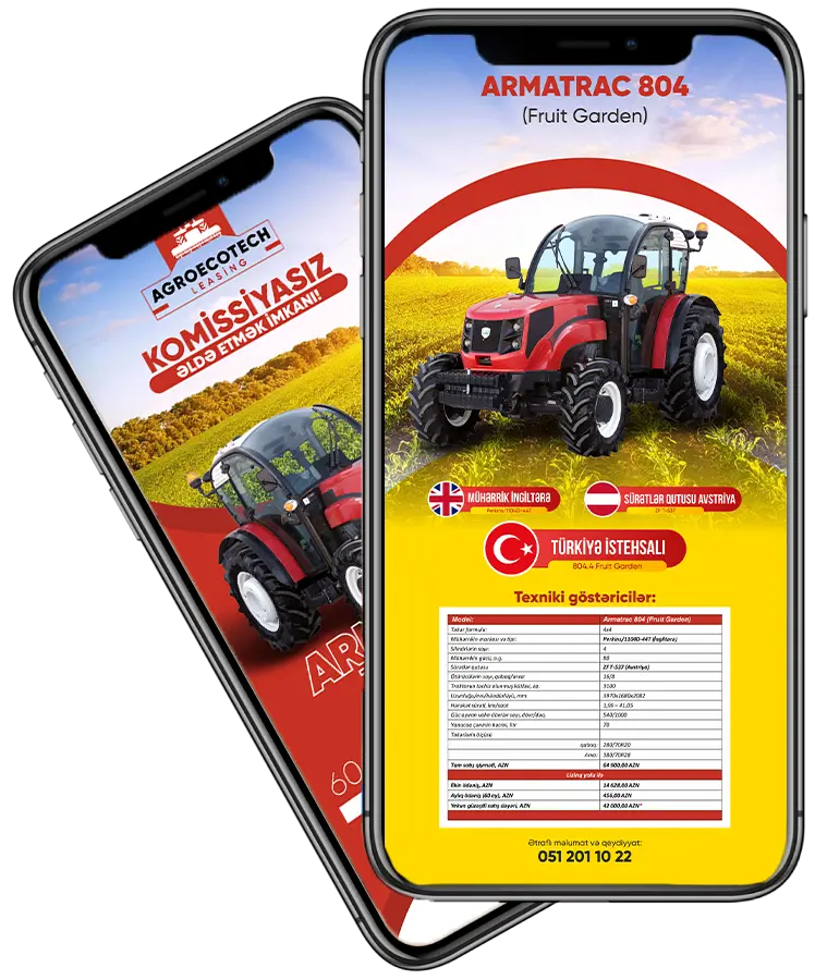 Agroecotech Leasing 2019-ci ildən etibarən kənd təsərrüfatı sektorunda yüksək keyfiyyətli xidmətlər təqdim edir. Traktorlar və aqreqatlar üzrə 20% ilkin ödəniş və 40% dövlət subsidiyası ilə sərfəli lizinq imkanı təmin edirik. Müştərilərimizin ehtiyaclarına uyğun ən yaxşı həlləri təklif edərək, onların bizneslərini daha da inkişaf etdirməyə dəstək oluruq.