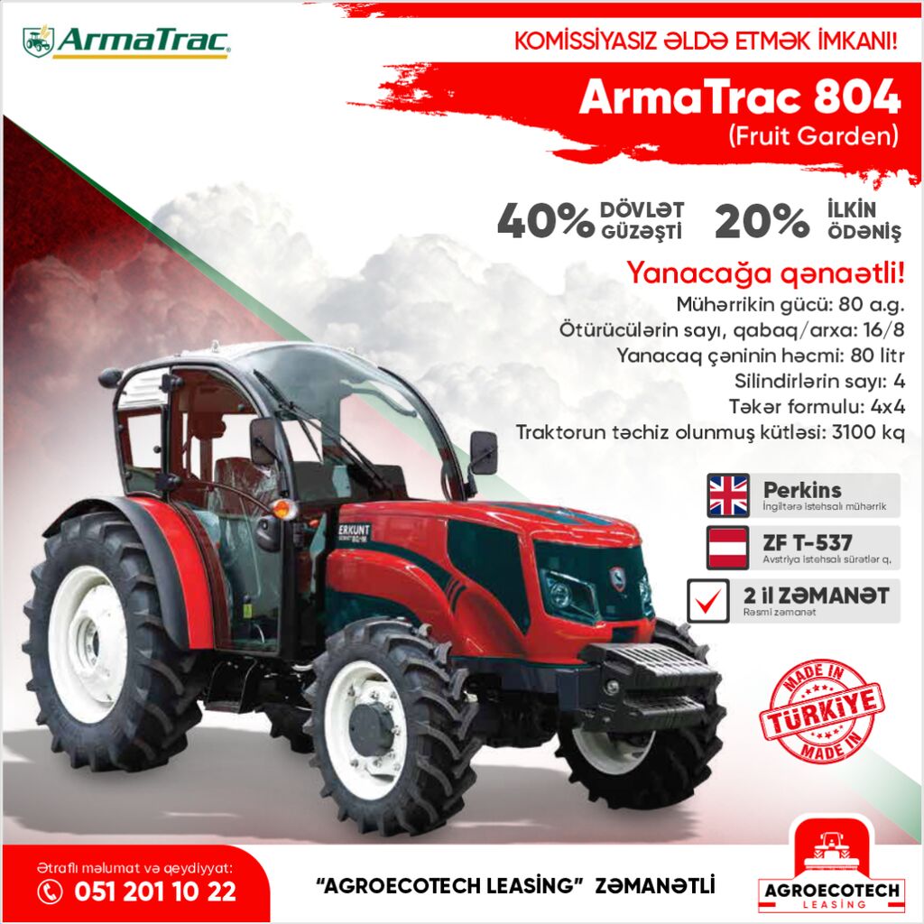 Traktor və aqreqatları 20% ilkin ödəniş və 40% dövlət subsidiyası ilə lizinq şərtləri ilə təklif edirik. Həmçinin, müştərilərimizə yüksək keyfiyyətli servis və dəstək xidmətləri təqdim edirik.